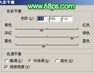 4、按Ctrl + B 调整色彩平衡,参数设置如图