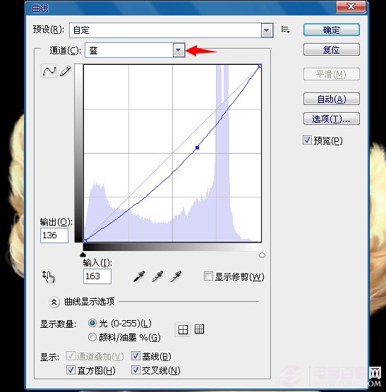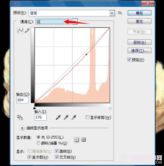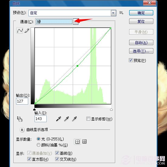 7、此时我们感觉脸部颜色差别很大,我们使用曲线对红、绿、蓝通道进行调整,如下图所示。