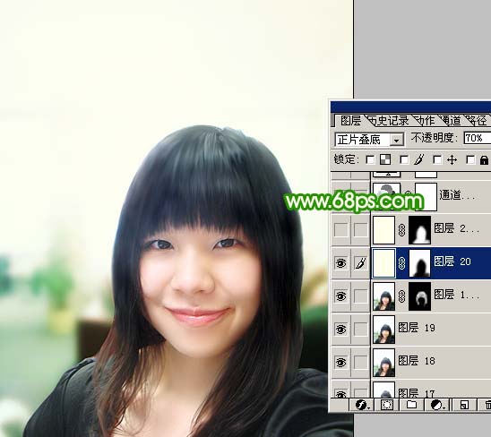 12、新建一个图层,填充颜色:#FEFFEB,图层混合模式改为“正片叠底”,图层不透明度改为:70%,效果如下图。