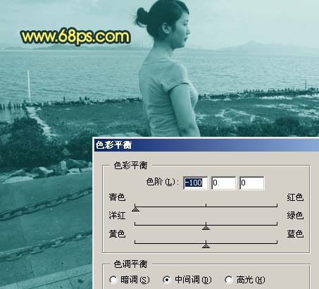 4、新建一个图层,盖印图层,按Ctrl + Shift + U 去色,按Ctrl + B 调整色彩平衡,参数设置如图,确定后把图层混合模式改为“颜色加深”,图层不透明度改为:50%。