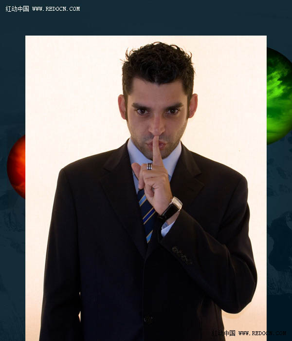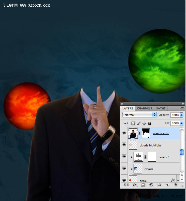 11、现在粘贴西装男子的照片。然后应用一个图层蒙版,用黑色画笔来掩盖照片背景和男人的头。利用好你的时间,这一步,需要真正准确的分切出来。