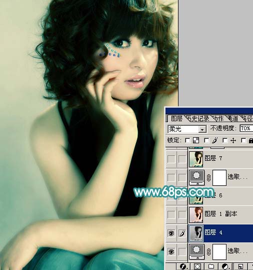 6、新建一个图层,盖印图层,按Ctrl + Shift + U 去色,再执行:滤镜 > 模糊 > 高斯模糊,数值为5,确定后把图层混合模式改为“柔光”,图层不透明度改为:70%,效果如下图。