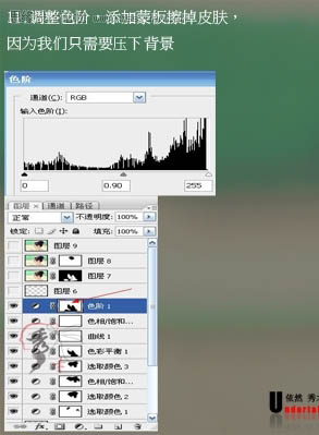 11、创建色阶调整图层,参数设置如下图,确定后用黑色画笔把皮肤部分擦出来。