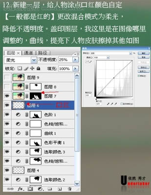 12、新建一个图层,图层混合模式改为“柔光”,用红色画笔给人物加上口红,适当降低不透明度。确定后再创建曲线调整图层,参数设置如下图,确定后只保留人物皮肤部分,其它部分用黑色画笔擦掉。