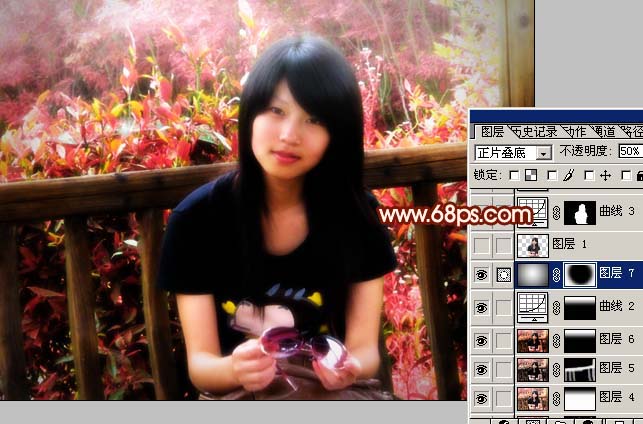 6、新建一个图层,选择渐变工具,颜色设置为黑白,由中心拉出黑白径向渐变,然后把图层混合模式改为“正片叠底”,加上图层蒙版,用黑色画笔把中间部分擦出来,如图