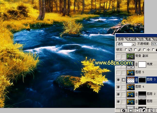 7、新建一个图层,盖印图层,执行:滤镜 > 模糊 > 高斯模糊,数值为5,确定后把图层混合模式改为“滤色”,图层不透明度改为:40%,加上图层蒙版,只保留图层上小部分,其它部分用黑色画笔擦掉,效果如图