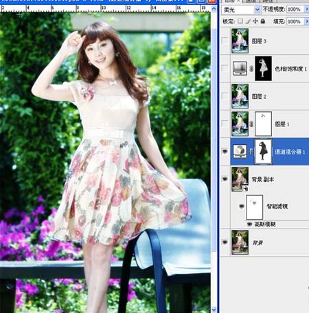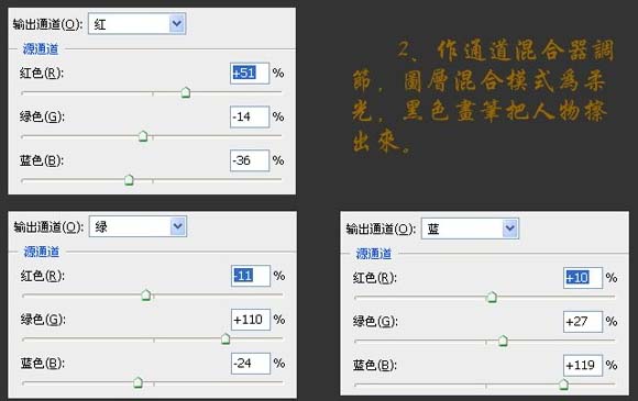 2、创建通道混合器调整图层,参数设置如下图,确定后把图层混合模式改为“柔光”,用黑色画笔把人物部分擦出来。