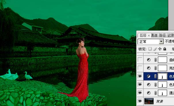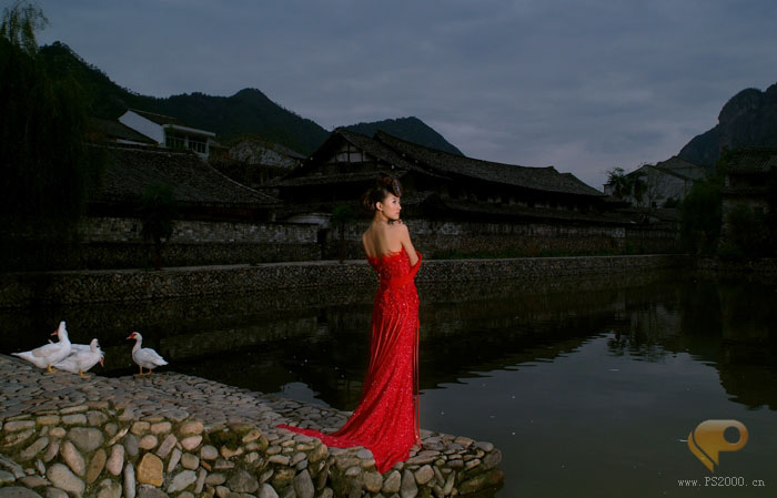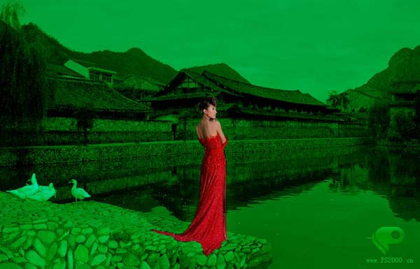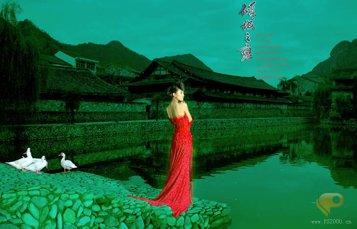 本教程的效果有种中国古典韵味。墨绿色的背景衬托出鲜红的人物。犹如开在绿叶中的鲜花。再加上背景部分为古典建筑,更加突出古典韵味,效果耐人寻味。