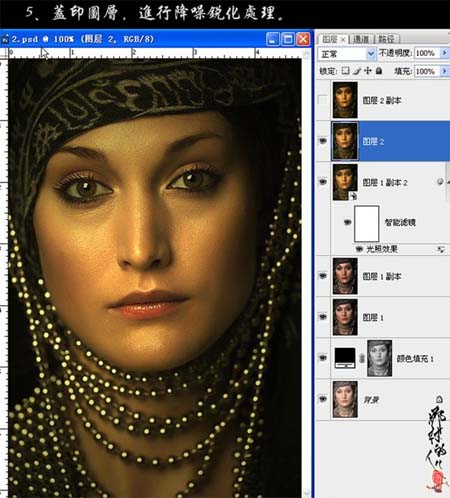 5、新建一个图层,盖印图层,对人物进行降噪及锐化处理。可以选择用外挂滤镜来完成。