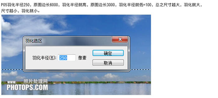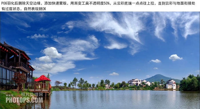 5、羽化后删除天空边缘,添加快速蒙版,用渐变工具不透明度50%,从云彩低端一点点往上拉,直到云彩与地面衔接处有过渡状态,自由就可以。