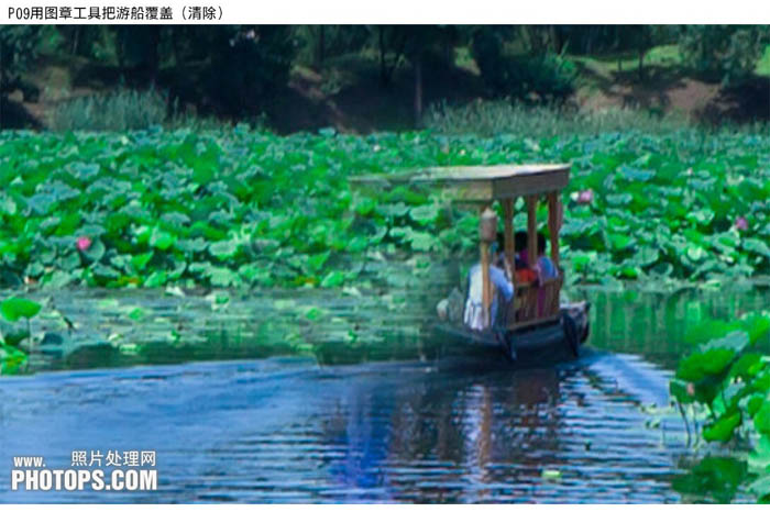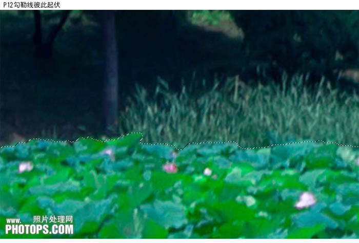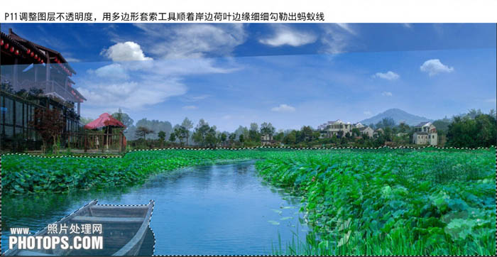 10、调整图层不透明度,用多边形套索工具顺着岸边荷叶边缘细细勾勒出蚂蚁线。
