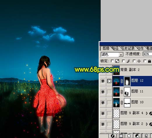 12、新建一个图层,盖印图层,把图层混合模式改为“滤色”,图层不透明度改为:40%,加上图层蒙版用黑色画笔把边角部分擦掉,如图