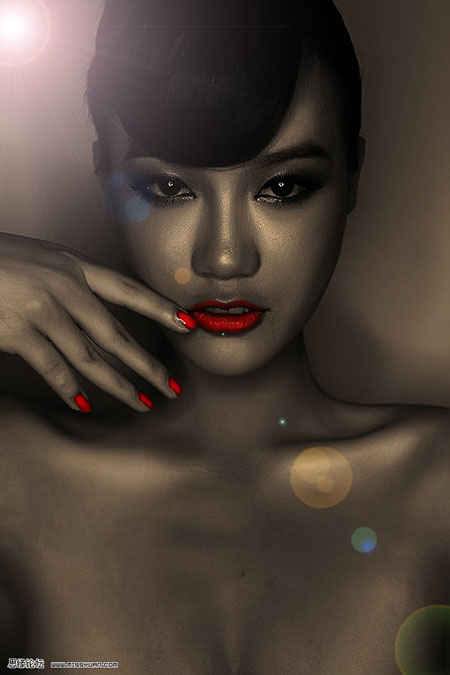 本教程简单介绍金色肤色调色方法。金色调色部分比较简单利用纯色叠加及一些调色工具即可实现,不过质感部分制作就要非常细心,需要控制好高光部分的光感。