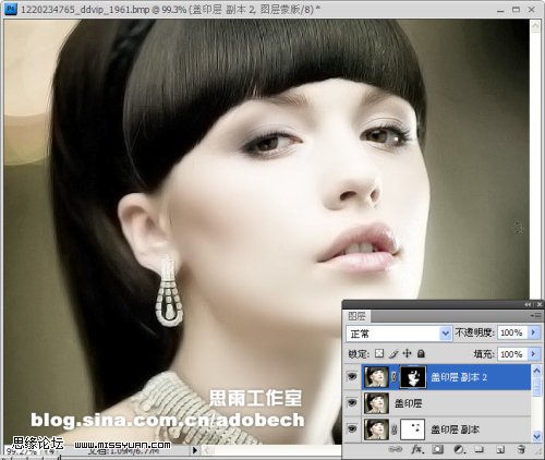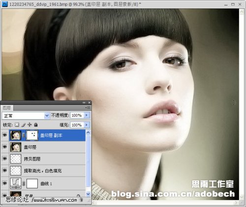 5、加上图层蒙板,用黑色画笔把眼睛,嘴巴涂出来。