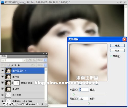6、新建一个图层,盖印图层,把盖印后的图层复制一层,执行:滤镜 > 模糊 > 表面模糊,参数设置如下图,确定后按住Alt键加上图层蒙版,用白色画笔把皮肤及脸部皮肤部分擦出来。