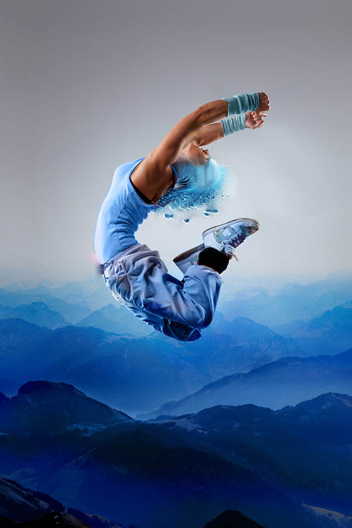 7、创建一个新图层,命名为Blue,颜色为#003e82,将人物的上衣、腰带及部分皮肤和山染成蓝色。将混合模式设为实色混合(Color),新建一个图层,涂掉孔雀的眼部,并添加一些头发。