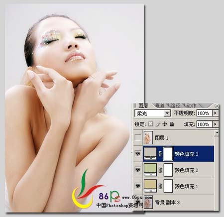 6、再建一个纯色调整层,颜色:#C1CA9A,图层模式设为:柔光,不透明度:15%。