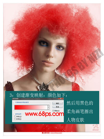 3、创建渐变映射调整图层,颜色设置如下图,确定后用黑色画笔把人物脸部及皮肤擦出来。