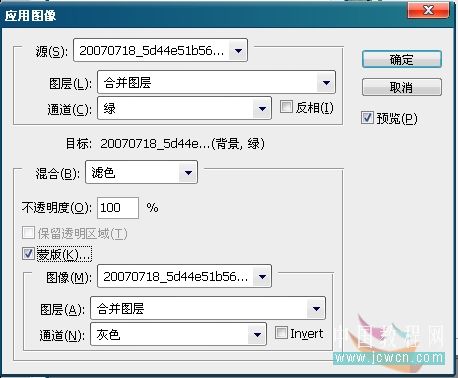2、转入通道面板,选中蓝色通道,图像-->应用图像,设置如下: