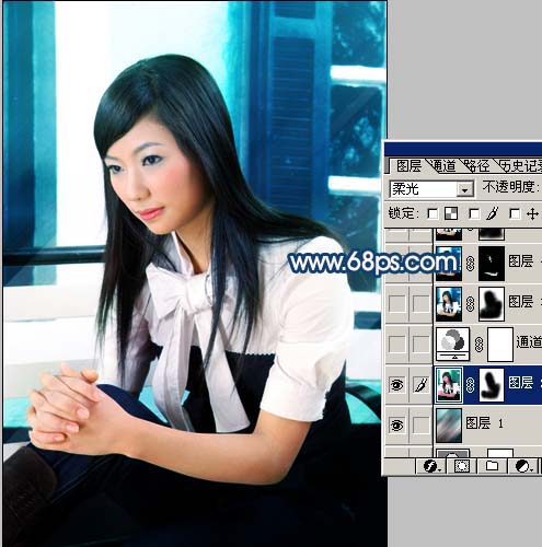 确定后按Ctrl + B调整色彩平衡稍微调青一点,然后把图层混合模式改为“柔光”,加上图层蒙版用黑色画笔把人物部分擦出来,效果如图