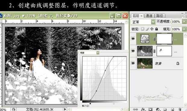 2、创建曲线调整图层呢个,做明度通道调节,参数设置如下图。