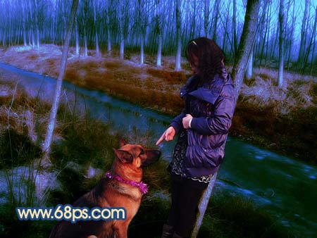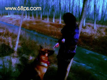 13、把背景图层复制一层,按Ctrl + Shift + ]移到图层的最上面,用钢笔工具把人物及狗勾出来,复制到新的图层,把背景副本隐藏,适当把抠出的人物调整下颜色及明暗度,效果如图