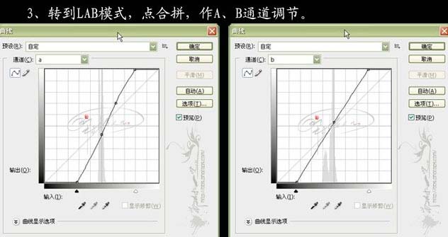 3、转到Lab模式,点合拼,然后创建曲线调整图层,参数及效果如下图。