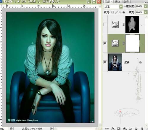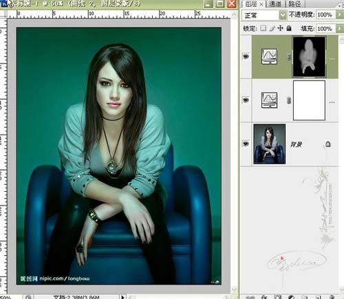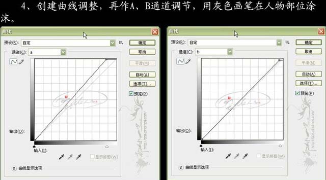 4、创建曲线调整图层,再对a,b通道进行调节,确定后用灰色画笔在人物部位涂抹。