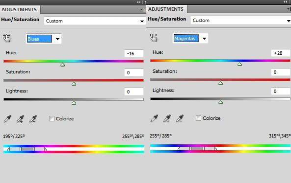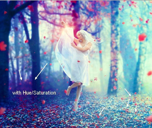69、我用色相/饱和度,纠正了一些树叶在地面上右边的色彩,更增添了青色的一幕。