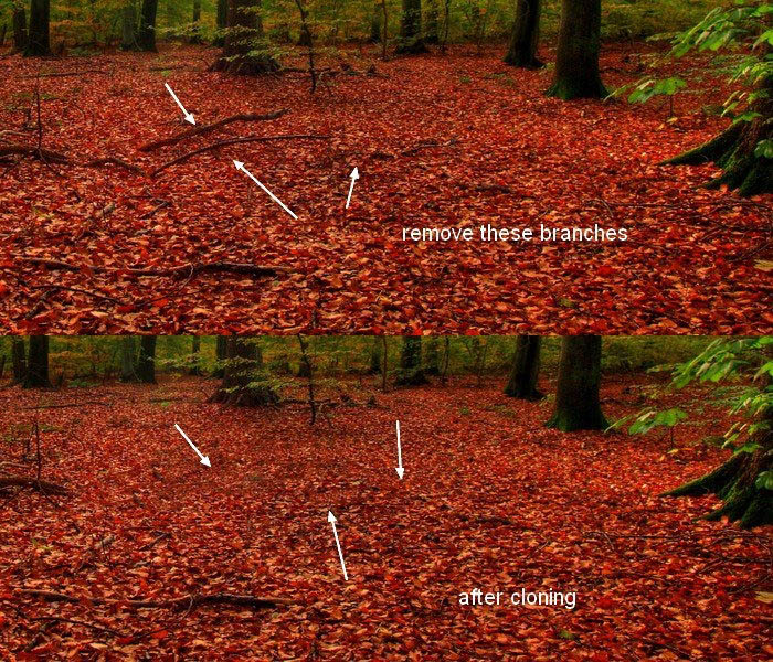 Ctrl键+opinion/ ALT + SHIFT+ N来创建一个新的图层。选择仿制图章工具(S),并使用它来清除地面上的一些树枝。