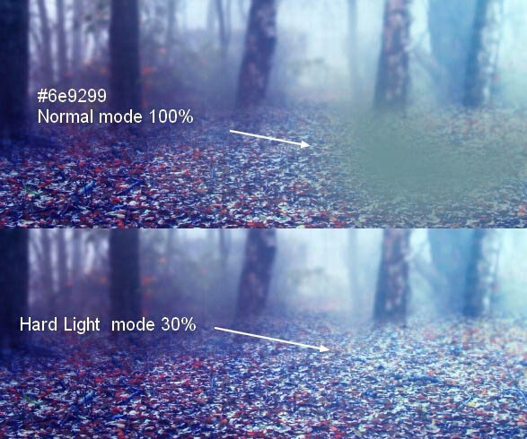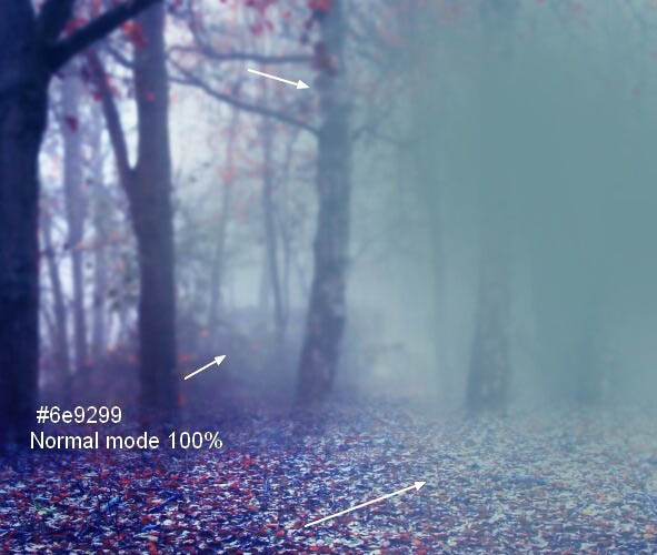 29、在一个新的图层中,我使用颜色为#6e9299的软的笔刷在图片右侧画。设置此层为强光100%的模式。