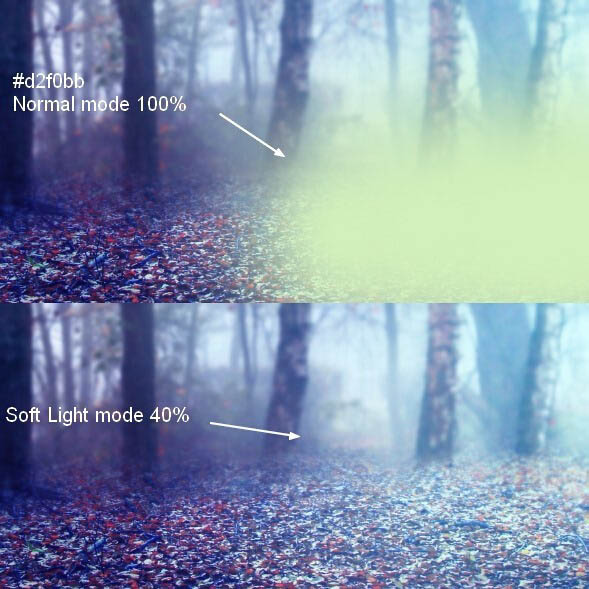31、为了添加更多梦幻般的效果,我用柔软的笔刷设置颜色为#d2f0bb画在它右边的地上。改变模式为柔光40%。