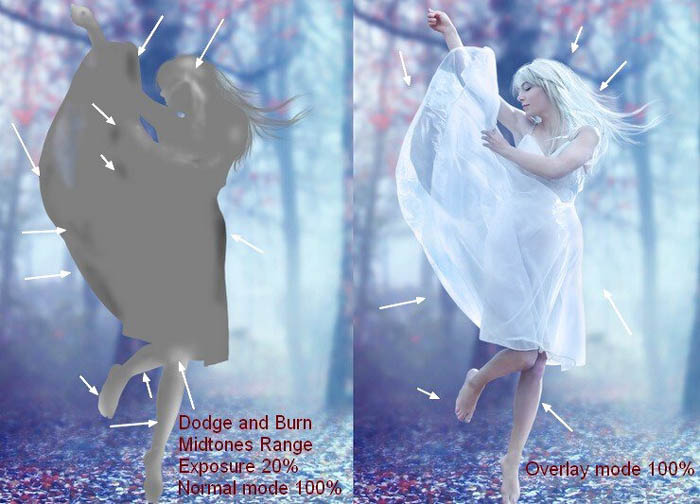 46、用减淡和加深工具(O)调节中间范围,曝光约20%至改进模特上的树荫和灯光。你可以看到我是怎么做它与普通模式和结果与覆盖模式。