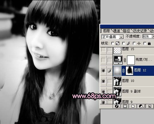 11、新建一个图层,选件渐变工具,颜色设置为黑白渐变,然后由中心拉出白色到黑色的径向渐变,再把图层混合模式改为“正片叠底”,图层不透明度改为:60%,加上图层蒙版用黑色画笔把人物部分擦出来,效果如图