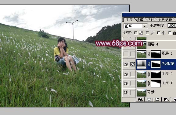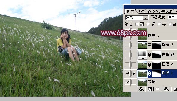 1、打开原图素材,按Ctrl + J把背景图层复制一层,图层混合模式改为“滤色”,加上图层蒙版用黑色画笔把天空部分擦出来,如图