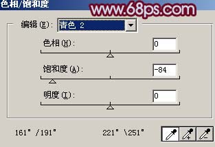 3、创建色相/饱和度调整图层,选择青色,然后用吸管吸取天空部分颜色,稍微降低饱和度,参数设置如图3,效果如图