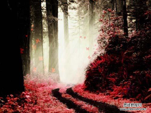 本教程介绍色彩单一的照片调色方。大致过程,先简单调整下图片的光感,然后调成自己喜爱的颜色,再适当的加上一些装饰元素,如光线及树叶等即可。