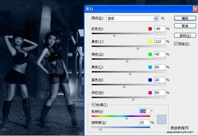5、新建黑白调整层(CS3以上版本才有这个调整层)。目的调色。数据如图: