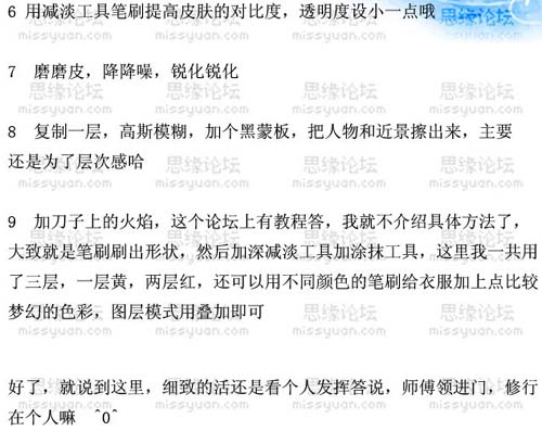 9、最后给刀子加上血迹,大致方法,先用红色笔刷刷出形状,然后用加深/减淡工具加涂抹工具,这里一共用了三层,一层黄色,二层红,还可以用不同的颜色笔刷给衣服加上比较梦幻的色彩,图层模式用叠加即可。
