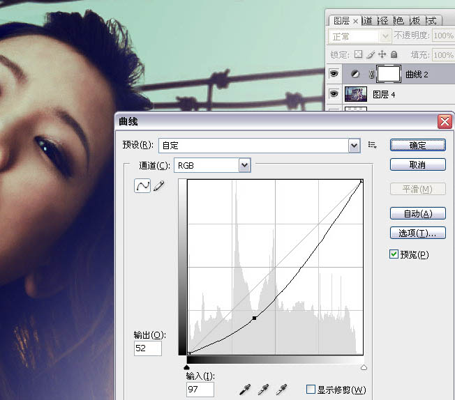 25、擦拭完毕后将图层4和图层4副本合并,在合并后的图层上执行调整图层曲线命令(注:曲线的调整在这里起到一个观察图像色块的作用,图像压暗后,人物的肤色的色块会显得更加明显,方便调整)。