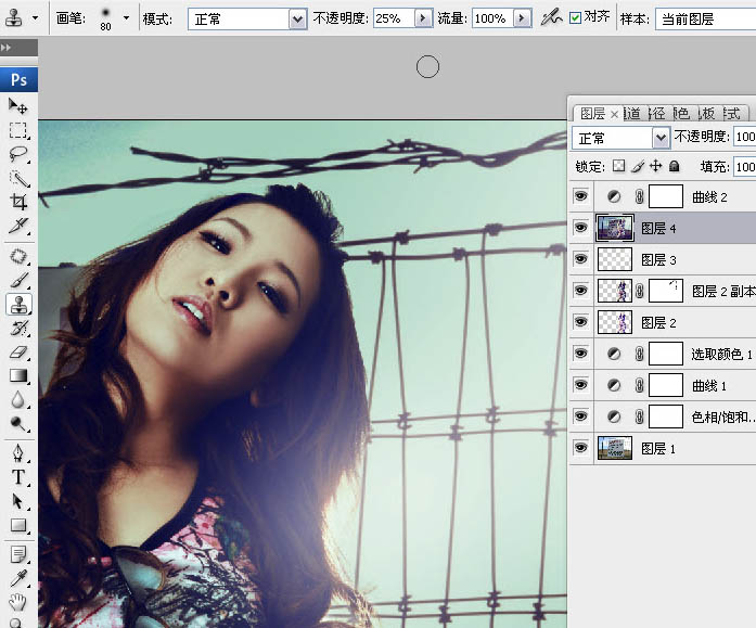 26、在图层4上用图章工具将人物肤色色块不均匀的地方适当的去修复(注:图章的不透明度为25%,硬度为0%)修复后,再将图层4上面的曲线图层去掉。