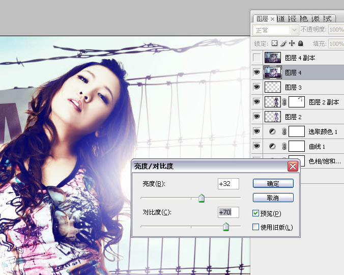 27、复制图层4,在图层4上执行亮度对比度:亮度+32,对比度+70