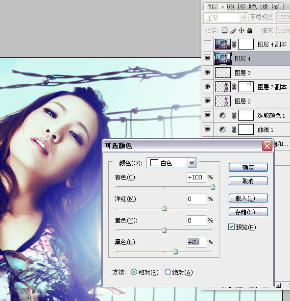 28、在图层4上执行可选颜色--白色,青色+100,黑色+23,其他数值不变。