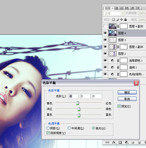 29、在图层4上执行色彩平衡--高光,高光加青色,参数如图所示。