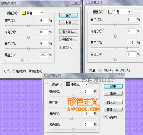 4、创建可选颜色调整图层,对黄、白、中性色调整,参数设置如下图。