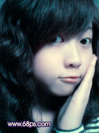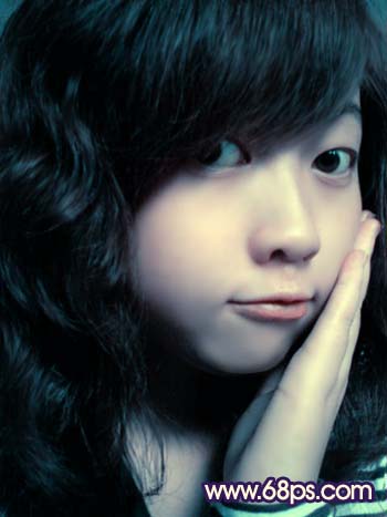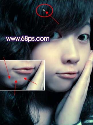 5、人物的下巴位置有一些色块不太均匀,选择吸管工具吸取色块周围较干净的人物肤色,然后用画笔工具在有杂色的地方轻轻点一下,画笔的不透明度控制在10%左右,点的时候要注意好过渡。大致效果如图