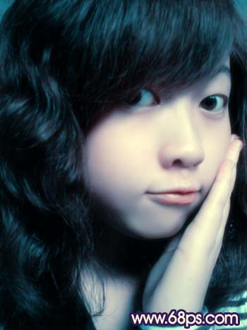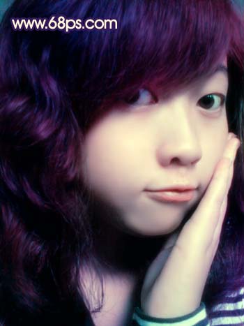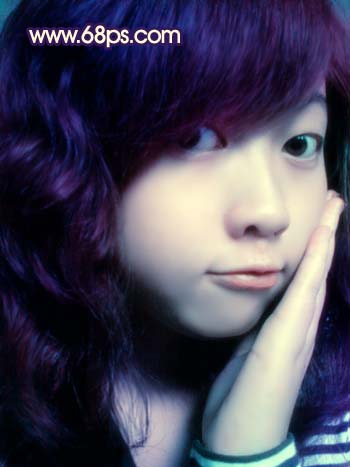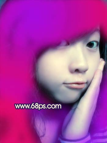8、新建一个图层,用画笔工具选择紫色和紫红色涂抹头发及衣服位置,涂的大致效果如图