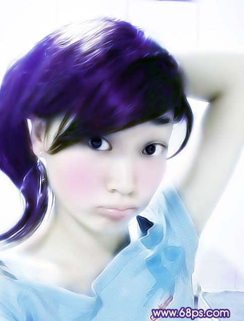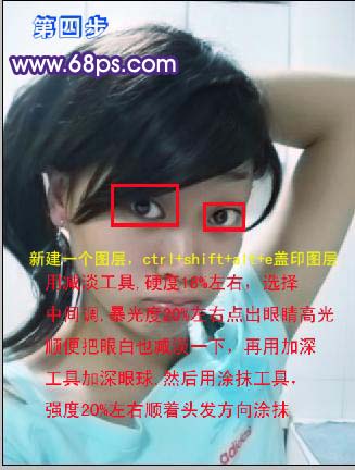4、新建一个图层,盖印图层,选择减淡工具,硬度10%左右,选择中间值,曝光度20%左右点出眼睛的高光,顺便把眼白也减淡一下,再用加深工具加深眼球,然后用涂抹工具强度20%左右顺着头发方向涂抹。