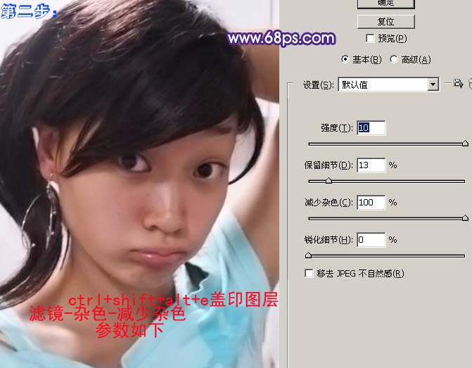 2、新建一个图层,按Ctrl + Alt + Shift + E盖印图层,执行:滤镜 > 杂色 > 减少杂色,参数设置如下图右。