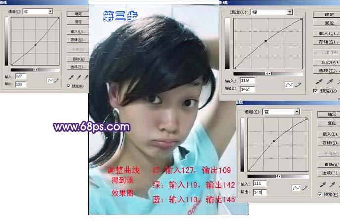 3、创建曲线调整图层,参数设置如下图,分别对红、绿、蓝通道进行调整。